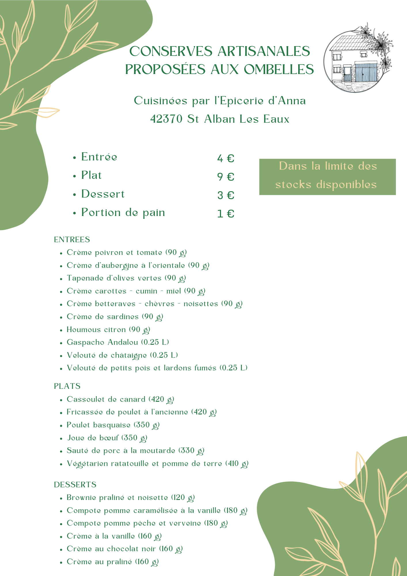 Pour vos dîners, vous avez la possibilité de réserver des bocaux de plats préparés à réchauffer. Ils sont élaborés par l’Epicerie d’Anna située à Saint-Alban les Eaux, petit village de la Loire. C’est la formule idéale si vous êtes en itinérance sur le GR 441 ou la GTMC.